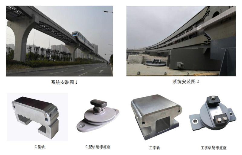 跨座式單軌鋼鋁複合接觸軌係統產品安裝於軌道梁兩側, 通過集電靴向電力機車提供電能。該係統產品具有使用壽命長、維護量小、安裝操作簡單等優點, 尤其適用於小限界安裝使用。