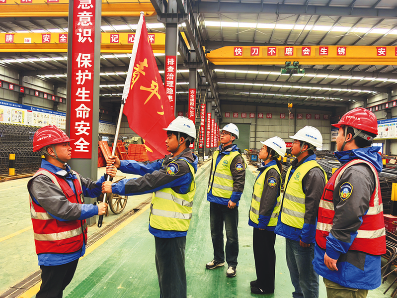 2月27日,隨著春節假期結束,項目建設迎來複工複產關鍵期。中鐵八局政和大道項目部組織開展“青年安全質量監督崗”複工複產動員活動,引導青年員工以飽滿熱情投身安全生產一線,助力項目建設平穩開局。圖為授旗儀式。 危唯 攝