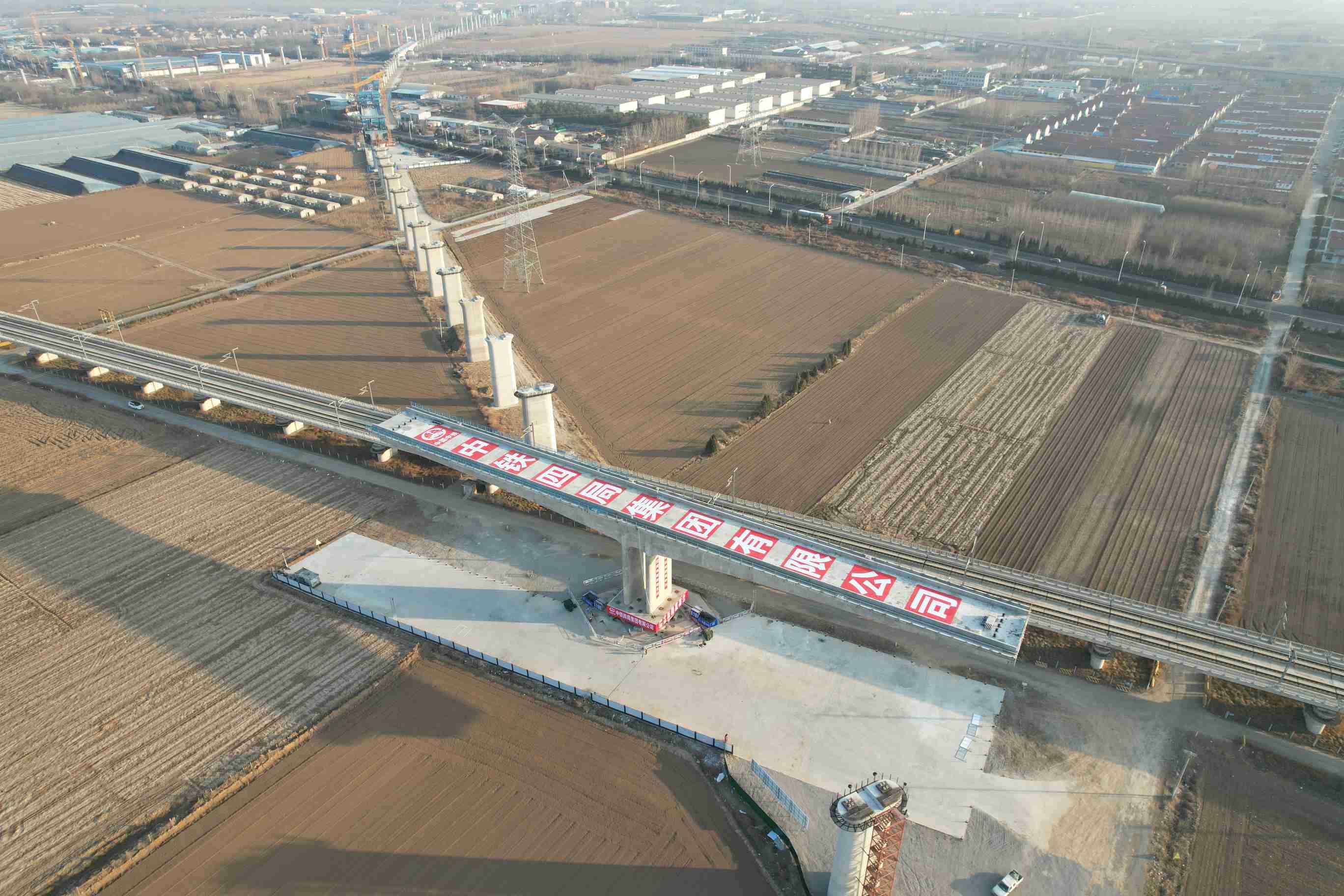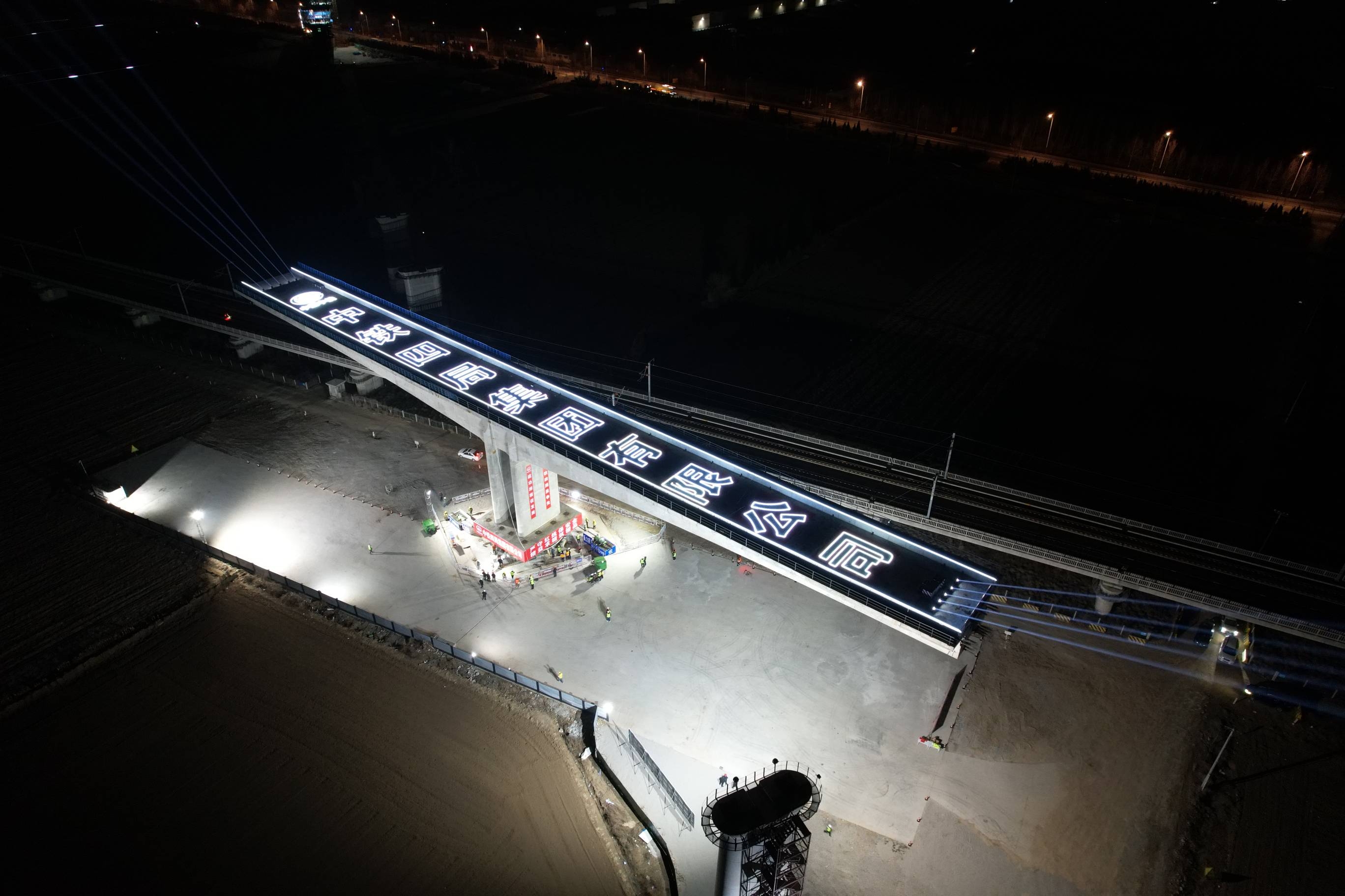 2月3日淩晨,中國中鐵旗下中鐵四局承建的濰(坊)宿(遷)高鐵濰坊特大橋跨濰榮高鐵(64+64)米T構轉體梁就位。