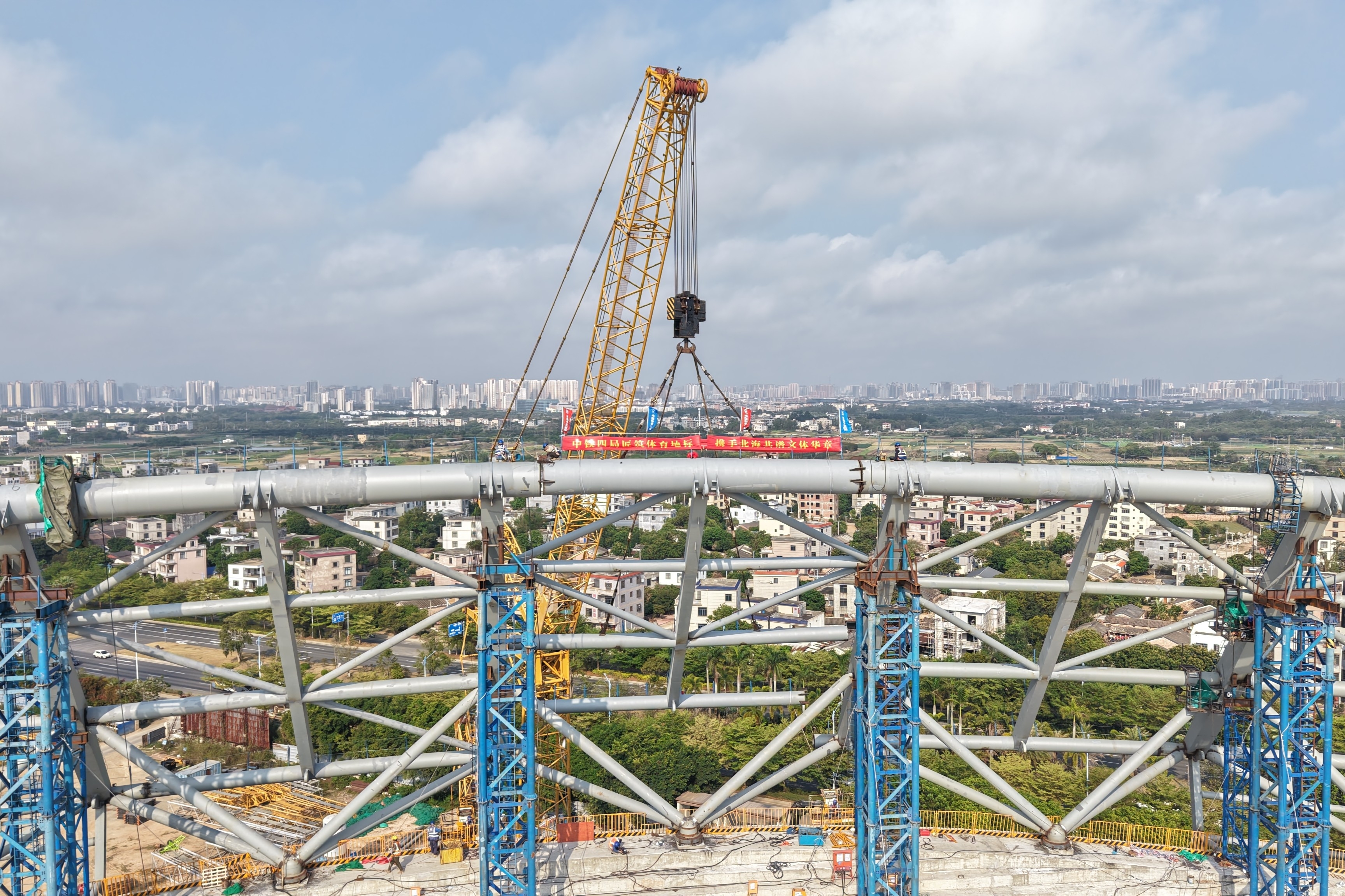 3月23日,由中鐵四局承建的中國東盟(北海)體育實訓基地體育場鋼屋蓋結構合龍。