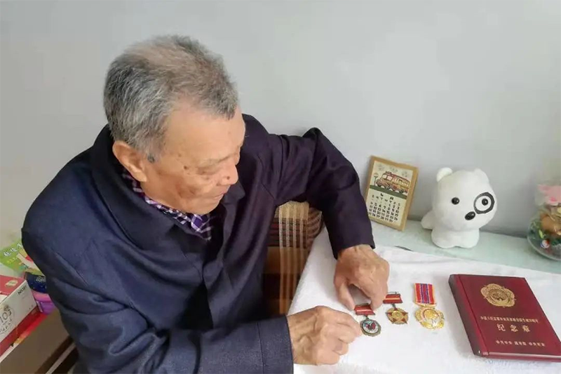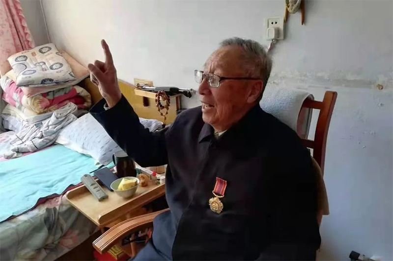這位老人是中國中鐵九局七公司離退職工,他叫王俊起,1951年8月1日參加抗美援朝。戰爭時期,他在五木裏,白天負責看守防空電話,晚上負責鐵路接車,充當搶修隊的“眼睛”和火車的“引路人”。期間,他在防空洞裏,一住就是三年。