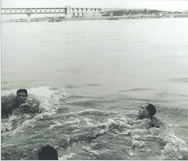 彙報結束後,毛主席休息了一會就開始下水遊泳,並多次穿過水流湍急的橋墩附近。那裏停泊著不少正在施工的吊船、駁船,水中布有不少錨鏈,他泰然自若地遊了過去。暢遊長江後,毛主席興致未盡,於6月2日揮毫寫下了《水調歌頭·遊泳》。
