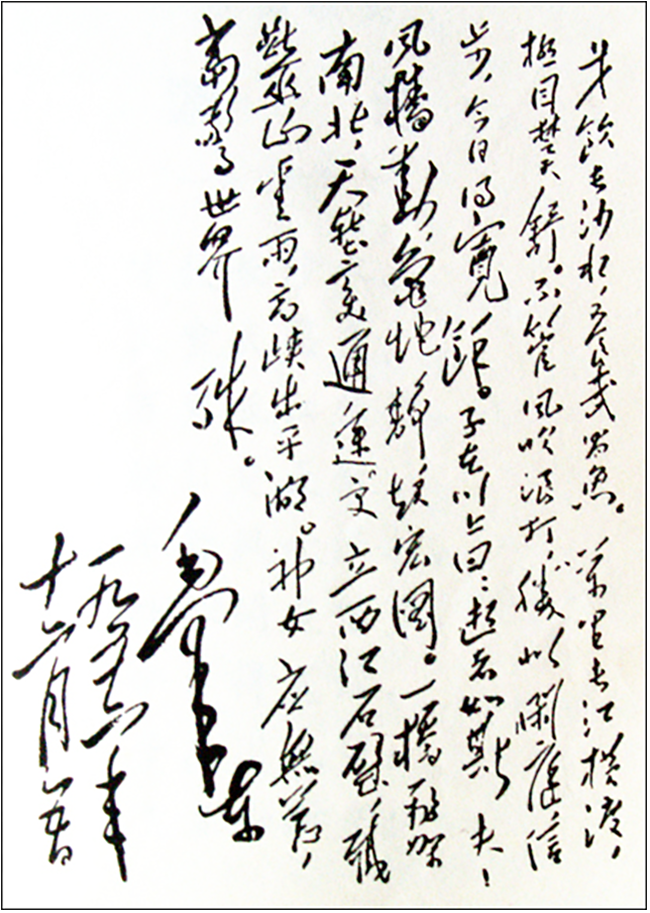 楊在田又拿出紙和筆請毛主席題詞。毛主席認真地說:“這可要好好想一想。”王任重說:“主席,您就題‘一橋飛架南北,天塹變通途’嘛。”“到東湖後考慮考慮再寫。”毛主席說,隨後與大家握手告別。幾天後,毛主席派人送來了題詞,正是“一橋飛架南北,天塹變通途”。