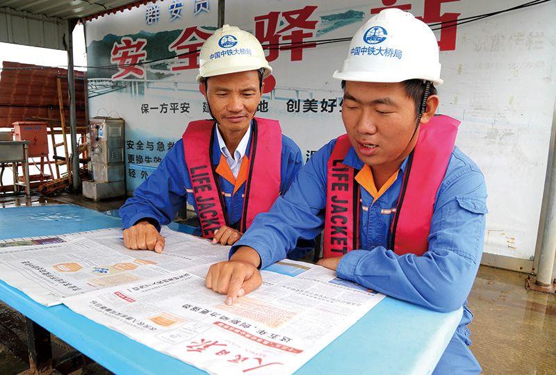 10月29日,中鐵大橋局珠機城際金海大橋項目部員工利用工餘時間,從報紙上認真學習了解黨的十九屆五中全會盛況。